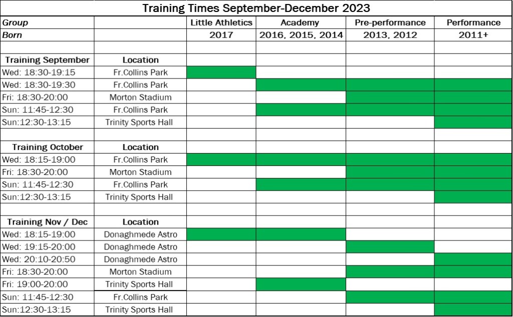 - The Pre-performance athletes (born 2013 & 2012) will train three times a week. On Wednesday, Friday and Sunday. Friday will be in Morton Stadium, Santry and Sunday will be in Fr. Collins Park.