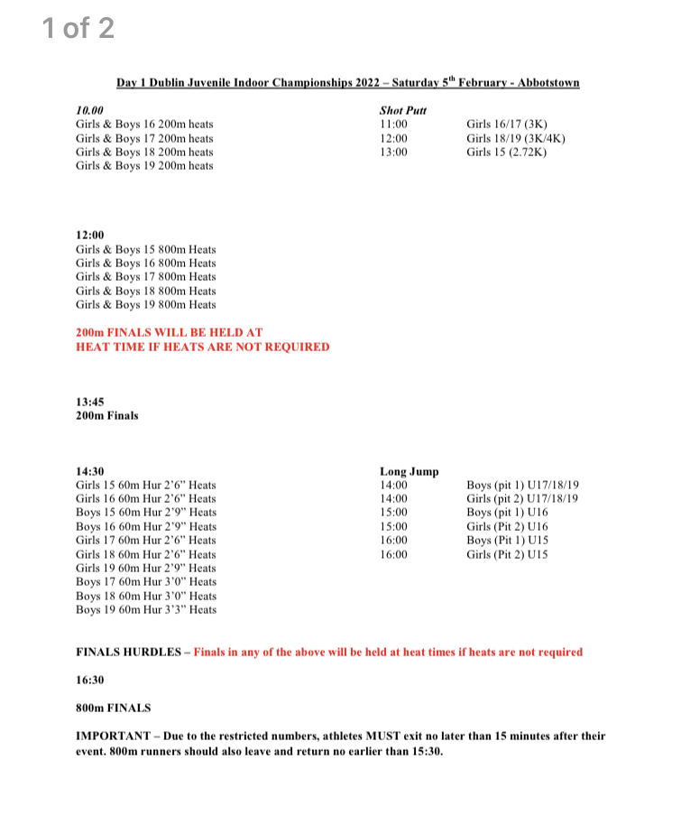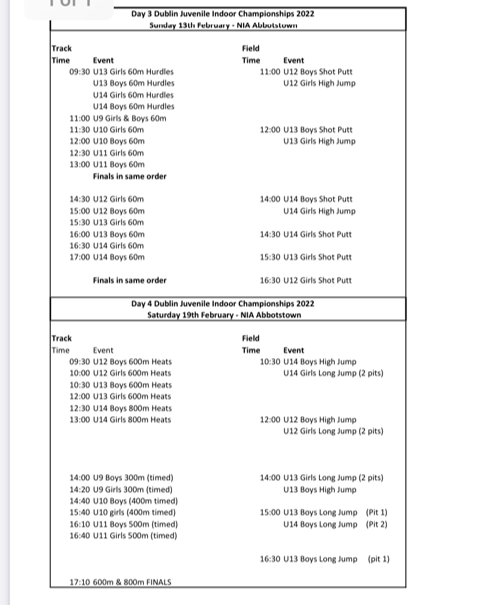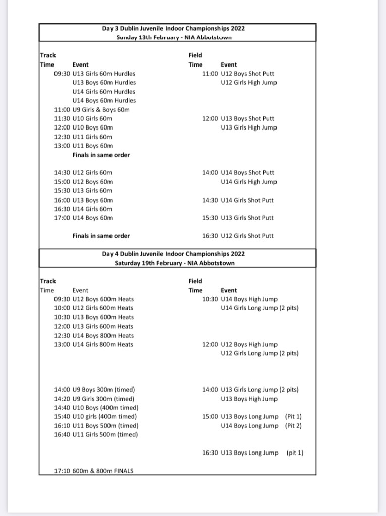 Dublin Indoor Championship Update: With the lifting of most of Covid restrictions, all dates have been confirmed for the Dublin Indoor Championships with all taking place in the National Indoor Arena in Abbottstown. This is great news and the athletes now have an exciting indoor season to look forward to for the month of February. Spectators are allowed to attend with a €5 admission fee. Athletes will need a competition vest or Clongriffin AC t-shirt when competing. Spikes are optional but are beneficial.