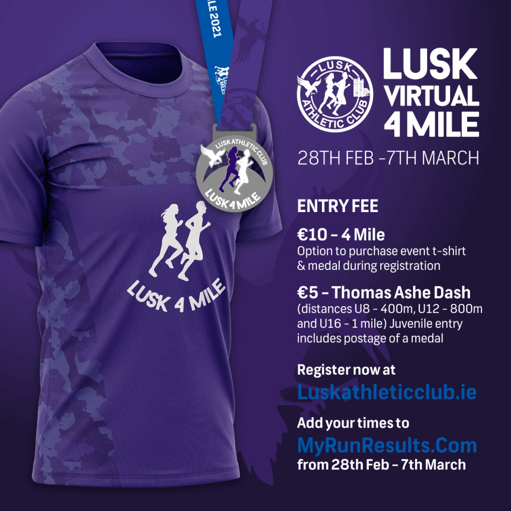 Good news that although we are still in lockdown we will be entering athletes in the upcoming Lusk AC Thomas Ashe Dash, a virtual race for all ages.